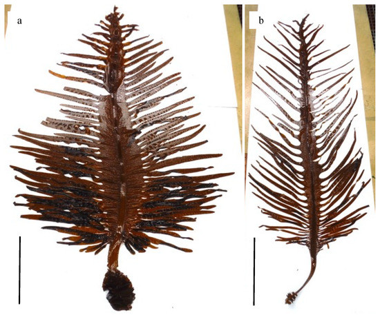 Photographs of typical thalli of Undaria pinnatifida. MAT (a) and HRT (b), harvested in March 2015. These thalli began to be cultivated in set III, on 19 October 2014. The scale bars are 50 cm.