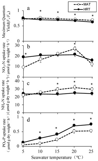 Maximum quantum yield (Fv/Fm,) (a), nitrate (NO3–N) uptake rate (b), ammonium (NH4–N) uptake rate (c), and phosphate (PO4–P) uptake rate (d) in Undaria pinnatifida at different seawater temperatures. The values are means ± standard deviations ((a): n = 30 individuals, (b–d): n = 5 individuals). The asterisks indicate significant differences between MAT and HRT at p < 0.05, according to a t-test.