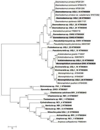 Partial sequence of the 18S rRNA gene is a widely accepted and commonly used approach in microalgae identification [46,47,48,49]. However, the analyses of sequence, phylogeny and morphology were inconclusive to identify all microalgal strains to the species level in this study. Resolution and reconstruction of relationships at the species level is rather limited due to the high conservation of the 18S rRNA gene [43,48,50], and the fact that small subunit ribosomal (SSU) RNA often underestimates the true number of species in planktonic microalgae [48,50]. Although the majority of microalgae taxa are described based on morphological taxonomy, species identification remains challenging, due to the difficulty of observing specific morphological characteristics and the morphological variations at different life stages [51]. In addition, phenotypic plasticity caused by environmental conditions [52] and genotypic differences have been reported in many microalgae [53,54]. The studied taxa Monoraphidium, Ankistrodesmus and Kirchneriella formed a monophyletic clade within Chlorophyceae, but interestingly, two Monoraphidium spp., (M. convolutum GW5 and Monoraphidium sp. UQL1_20) did not form a distinct clade. This finding supports the view of Fawley et al. [55], and Krienitz et al. [47,56], where species of the family Selenastraceae under existing taxonomic criteria display a polyphyletic nature. Further analyses using a combination of morphological characteristics, including ultrastructure [46,47,51] and DNA sequence including the internal transcribed spacer 2 (ITS2) rDNA, which has higher substitution rates in comparing with 18S rRNA gene [43,47,48,50,56], are required for discrimination of algal species.