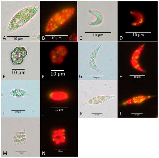 Images of Scenedesmus dimorphus NT8C (A,B), Monoraphidium convolutum GW5 (C,D), Scenedesmus sp. GW63 (E,F), Ankistrodesmus sp. UQL1_13 (G,H), Desmodesmus sp. UQL1_19 (I,J), Monoraphidium sp. UQL1_20 (K,L), Desmodesmus sp. UQL1_26 (M,N) under the compound microscope with bright field and epifluorescent light. Neutral lipids are shown as yellow droplets after Nile red staining, whereas chlorophyll is shown in red.