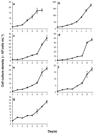 Growth curves of S. dimorphus NT8C (a), M. convolutum GW5 (b), Scenedesmus sp. GW63 (c), Ankistrodesmus sp. UQL1_13 (d), Desmodesmus sp. UQL1_19 (e), Monoraphidium sp. UQL1_20 (f), Desmodesmus sp. UQL1_26 (g). Shown are mean values (±SE) from three separately-grown replicate cultures (six replicates for reference strain S. dimorphus NT8C).