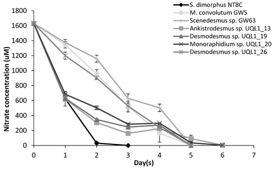 Nitrate usage of the seven microalgal strains used in the growth experiment. Shown are mean values (±SE) from three replicates (six replicates for S. dimorphus NT8C). Due to the experimental error and natural variation of the method used for measuring nitrate concentration, the values less than 100 µM were too low to be measured accurately.