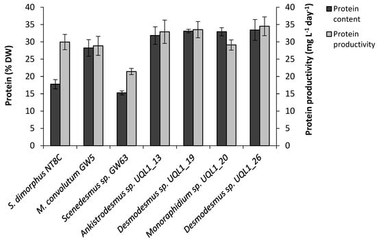 Total protein content (% DW) and protein productivity (mg L−1 day−1) of the seven microalgal strains used in this study. Shown are mean values (±SE) from three replicate cultures (six replicates for S. dimorphus NT8C).