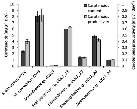 Striking variation (ranging from 0.1 to 8.1 mg g−1 DW) of the total carotenoid content was found across the studied strains (Figure 6). M. convolutum GW5 accumulated the largest amount of carotenoids (8.1 mg g−1 DW), followed by Ankistrodesmus sp. UQL1_13 (6.0 mg g−1 DW) and Monoraphidium sp. UQL1_20 (4.9 mg g−1 DW). Scenedesmus sp. GW63 had the lowest content of carotenoids (0.1 mg g−1 DW), followed by Desmodesmus sp. UQL1_26 (1.0 mg g−1 DW). M. convolutum GW5 had the highest carotenoid productivity (0.8 mg L−1 day−1), which was up to 694.6% greater than that of Scenedesmus sp. GW63 and Desmodesmus sp. UQL1_26, and 106.0% greater than that of S. dimorphus NT8C.