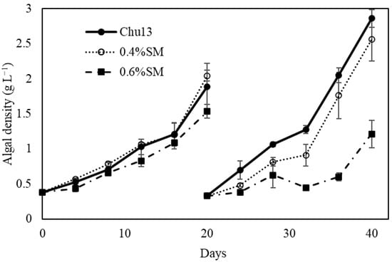 Figure 1 shows the growth rates of the Yamanaka strain in Chu13 and saltwater media. There was no difference in the growth rates between 0.4% SM and Chu13 media from 0 to 20 d before subculturing. In contrast, 0.6% SM significantly reduced the growth rate. Immediately after subculturing at 20 days, the growth rate was suppressed in 0.4% SM compared to that in Chu13 medium. However, after 32 days, the growth rate in 0.4% SM recovered and was almost equal to that in Chu13. The culture in 0.6% SM was overstressed by the salt water, with periods of almost no increase in algal concentration during 28–35 days. The 0.6% SM medium 0.6% SM significantly inhibited the growth of the Yamanaka strain of B. braunii.