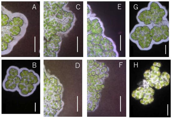 Optical microscope image of algal slurry of Yamanaka strain mixed with India ink. White bars in the lower right corner of the image indicate 20 µm. (A,B), Chu13; (C), 0.4% SM at day 4; (D), 0.4% SM at day 20; (E), 0.6% SM at day 4; (F), 0.6% SM at day 20; (G), heat treatment at 55 °C; (H), heat treatment at 60 °C.