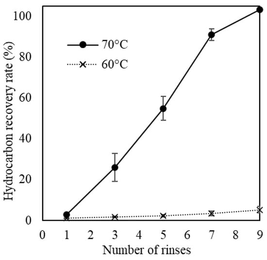 Effect of the number of rinses with hot-water at 60 °C and 70 °C on hydrocarbon recovery rate (n = 3, mean ± SD).