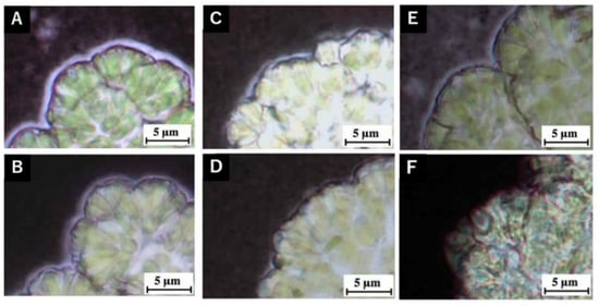 Optical microscope image of algal slurry of Showa strain mixed with India ink. (A), no treatment; (B), 9th hot-water rinsing at 60 °C; (C), 5th hot-water rinsing at 70 °C; (D), 9th hot-water rinsing at 70 °C; (E), heat treatment at 80 °C; (F), heat treatment at 85 °C.