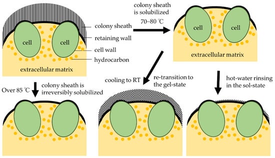 The polysaccharides that make up the colony sheath change to the sol state at 70 °C and are irreversibly solubilized at 85 °C (Figure 5) [25]. The difference between the presence or absence of a colony sheath at 80 °C and 85 °C (Figure 4E,F) is related to the gel-sol transition of polysaccharides. Figure 2E shows a colony that was heat treated at 80 °C and cooled to room temperature before microscopic observation. These observations suggest that once the colony sheath transits to the sol state, it reversibly re-transitions to the gel state around B. braunii colonies during cooling to room temperature. In our previous study, there was a clear difference in the hydrocarbon recovery rates between 80 °C (4.9%) and 85 °C (94.4%) [18]. The removal of the colony sheath and the improvement in hydrocarbon recovery require pretreatment by heating to a temperature above the irreversible point.