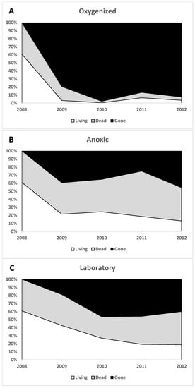 The average disappearance of cysts over time in the different environments during the first 4 years. The black area denotes disappeared cysts, gray represents dead and empty cysts, and white denotes filled live-appearing cysts. (A) oxygenized, (B) anoxic, and (C) laboratory (refrigerated) environments.