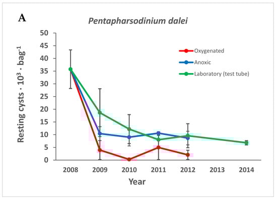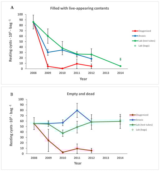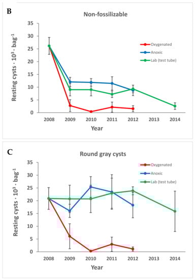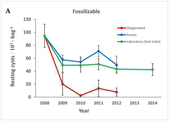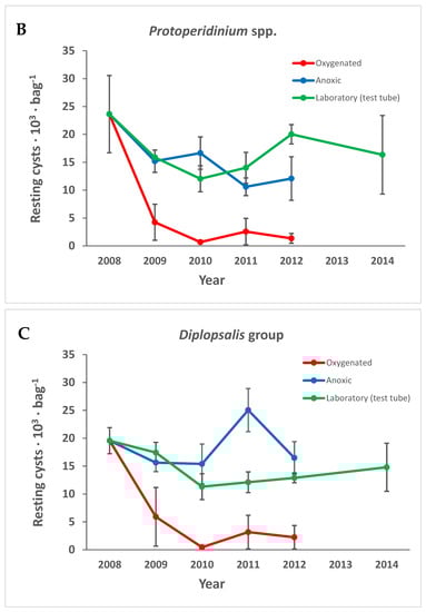 There is a well-known difference in cyst abundance and species composition between oxygenated and anoxic sediments (e.g., [,,,]). Paleontologists routinely sample anoxic sediments because untouched layers of sediments allow dating of layers by radiometric methods. Biologists often make surveys, e.g., along coasts, and interpret differences in cyst occurrences as differences in production or accumulation, not as differences in preservation. Sometimes a “mixed layer” is described on top of anoxic layered sediment. Here, different animals consume and mix the sediment (containing cysts), before the cysts that survive the chewing, grinding, and the digestive fluids of one animal after the other as intact live cysts or as whole or broken empty cyst walls, are finally deposited in the anoxic, deeper layers.
