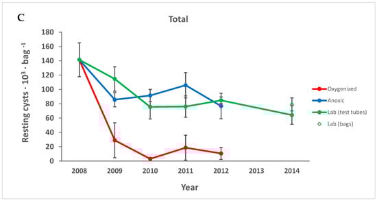 Cysts presumed to be alive, with live-like contents (A) decreased in all treatments, while the number of dead and empty cysts (B) decreased only in the oxygenated environment. The total number of cysts is shown in (C). Points are averages and error bars show the standard error of the mean.
