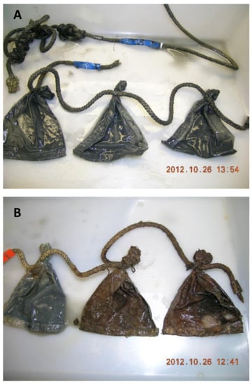 Variation was quite large between replicates in the same treatment (Figure 3) even though the sediment was well mixed before concentration in the sorter, during sorting, and before adding the concentrated cyst fraction to the bags. The anoxic macroenvironment was homogenous throughout the experimental period. The bags seemed unaffected, had no fouling growth, and the sediment within the bags was black (Figure 4A). There was no significant difference in cyst numbers or species composition among the three poles in the anoxic environment; the variation found was between samples (bags). The variation was, thus, intrinsic within the original concentrated sample that was divided into bags at the start of the experiment. In the oxygenized macroenvironment, there was a large variation even within short distances; bags tied to the same rope, ca. 20 cm apart, sometimes had one bag seemingly unaffected and containing ample sediment, while the bag a short distance from it was overgrown with bryozoans and nearly empty (Figure 4B).