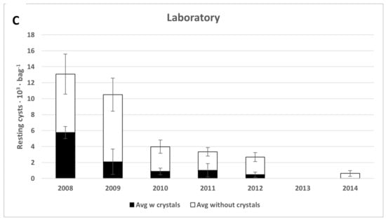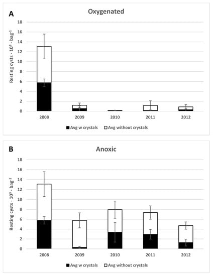 The total number of Scrippsiella spp. cysts with (black) and without (white) crystals. (A) oxygenized, (B) anoxic, and (C) refrigerated (test tube) environments. Error bars are the standard error of the mean.