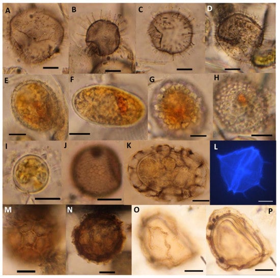 - Penaud, A.; Hardy, W.; Lambert, W.; Marret, F.; Masure, E.; Servais, T.; Siano, R.; Wary, M.; Mertens, K.N. Dinoflagellate Fossils: Geological and Biological Applications. Revue Micropaléontol. 2018, 61, 235–254. [Google Scholar] [CrossRef]