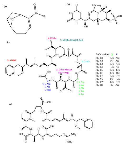 - Jones, M.R.; Pinto, E.; Torres, M.A.; Dörr, F.; Mazur-Marzec, H.; Szubert, K.; Tartaglione, L.; Dell’Aversano, C.; Miles, C.O.; Beach, D.G. CyanoMetDB, a comprehensive public database of secondary metabolites from cyanobacteria. Water Res. 2021, 196, 117017. [Google Scholar] [CrossRef]