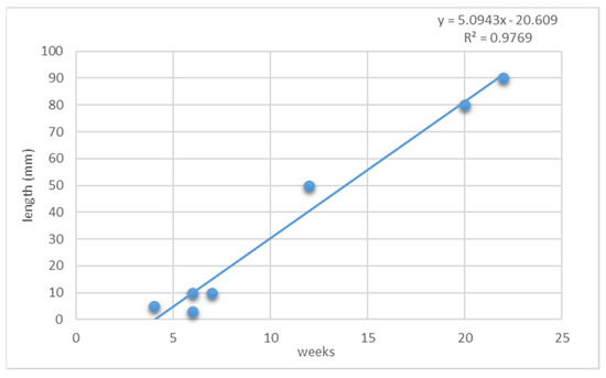 During five and a half months of the experiment, an upward trend of specimens’ growth was noticed (considering the blade’s average length, expressed in mm) (Figure 7). P. leucosticta maintained positive growth during the culture period for the majority of the thalli developed under experimental conditions.