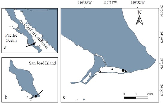 Map of the study site. (a) Location of San José Island in the SW Gulf of California (arrow); (b) location of San José Lagoon (arrow); (c) collection site of San José core (●) and surface (▲) sediment samples.