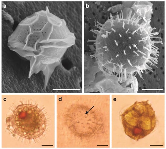 - Head, M. Modern dinoflagellate cysts and their biological affinities. In Palynology: Principles and Applications; Jansonius, J., McGregor, D.C., Eds.; American Association of Stratigraphic Palynologists Foundation: Dallas, TX, USA, 1996; pp. 1197–1248. [Google Scholar]