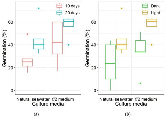 Germination of recent Pyrodinium bahamense cysts from San José Lagoon, SW Gulf of California: (a) in natural seawater and f/2 media for 10 and 20 days, and (b) under light and dark conditions for 20 days. Box plots show the median, lower (Q1) and upper (Q3) quartiles, and outliers (dots).