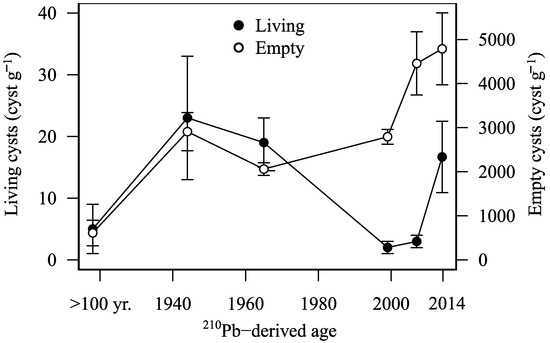 Except for sections 10–11 cm, 13–14 cm, and 22–23 cm (due to scarcity of sediment sample), living and empty P. bahamense cysts were counted using an Utermöhl chamber under an inverted microscope (Axiovert 100, Carl Zeiss A.G., Jena, Germany). The wet weight of samples was registered, and the water content was determined from samples selected for geochemical and dating analyses (Section 2.2). The abundance of living and empty cysts was expressed as cysts g−1 dry-weight sediment [69] using the following formula: