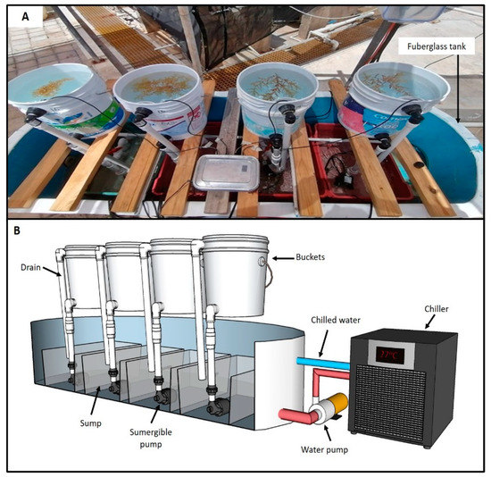 Specially designed closed continuous motion systems [17] were used to observe the growth rates of the sargasso (Figure 1). Each system included a 52 × 35 × 25 cm (approx. 45 L) sump, from which the water was pumped up to an 18 L bucket. To achieve the appropriate temperature, the sumps of the four systems were immersed in chilled seawater kept in a fiberglass tank (Figure 1). The setup included a total of 16 buckets in four fiberglass tanks. The tank water was never mixed with the sump water. The water temperatures were maintained within 1.0 °C of the target temperature, using chilling and heating systems. The water was taken from the mesotrophic Puerto Morelos reef lagoon (salinity 35 and pH 8.2) via a >1 km long PVC tube and passed through a sand filter.
