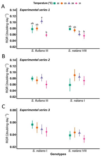 In the first experimental series (S. fluitans III vs. S. natans VIII), the genotype × temperature interaction was significant (Figure 2; Table S2), suggesting that both genotypes grew differently at different temperatures. Unlike S. natans VIII, which maintained consistent growth rates over the temperature range, S. fluitans III peaked at 28 °C and then dropped at 31 °C. Nonetheless, S. natans VIII grew more slowly at temperatures above 28 °C than S. fluitans III at 28 °C. In the second experimental series, where S. fluitans III was compared to S. natans I, neither the main effect of the genotype nor the temperature nor the interaction of genotype × temperature were statistically significant (Figure 2; Table S2). In the third experimental series, S. natans I grew faster than S. natans VIII (Figure 2; Table S2). Neither the temperature nor the interaction, however, were significant (Table S2).