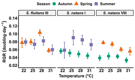 Relative growth rate (RGR, doubling d−1; mean ± SE) of S. fluitans III, S. natans I, and S. natans VIII in ex situ experiments at different temperatures and in different seasons.