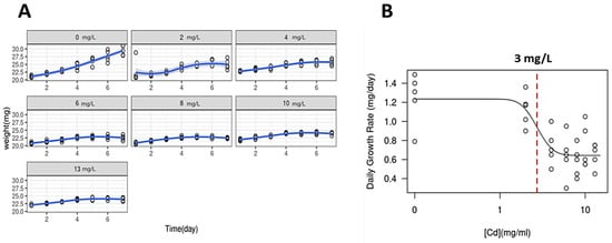 Daily Growth Rate (DGR) of the macroalga G. caudata under Cd2+ exposure. (A) Growth curves of Cd2+ exposure increasing concentrations groups (0 to 13 mg/L, indicated in gray boxes) and algal apexes weight variation for seven days. DGR for each treatment was obtained by the slope of the exponential phase of the growth curve, indicated as a blue line. (B) A dose–response curve showing the IC50 value calculated as 3 mg/L (dashed red line) that could be observed by 48 h of Cd2+ exposure. Shapiro–Wilk normality test was used for the comparison of the multiple data and ANOVA-one way comparing the result of each day.
