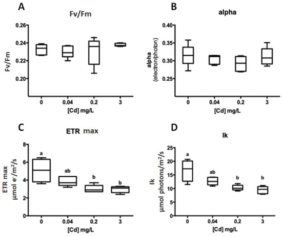 Photosynthetic parameters obtained by a fast light curve after 48 h of Cd2+ exposure (G. caudata). ANOVA one-way—(A) Fv/Fm: p = 0.5217; (B) alpha: p = 0.4189; (C) ETR max: p < 0.0001 comparisons between different concentrations (Tukey): 0 vs. 0.2 (p = 0.019); 0 vs. 3 (p = 0.0470); 0.04 vs. 3 (p = 0.0003) and 0.2 vs. 3 (p = 0.0002); (D) Ik: p = 0.0006 (Tukey): 0 vs. 0.2 (p = 0.0019) and 0 vs. 3 (p = 0.0006). a, b, and ab (at C,D) highlights when there was or not a statistical difference between the experimental groups (ex. a is statically equal to a or ab but not b).