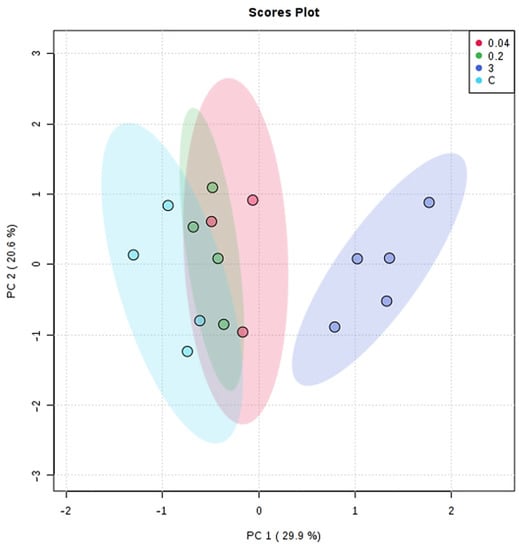 The variance observed by the PCA between the Cd2+ exposure groups was 50.5% (PC1: 29.9% and PC2: 20.65) (Figure 3). The complete separation of the metabolic profile between the Cd2+ exposure groups was observed only for the 3 mg/L compared to others. Comparing the control group with the lowest tested metal concentrations (0.04 and 0.2 mg/L), it was possible to notice occasional metabolite variation. However, the general metabolic profile was not considered significantly different from the control group.