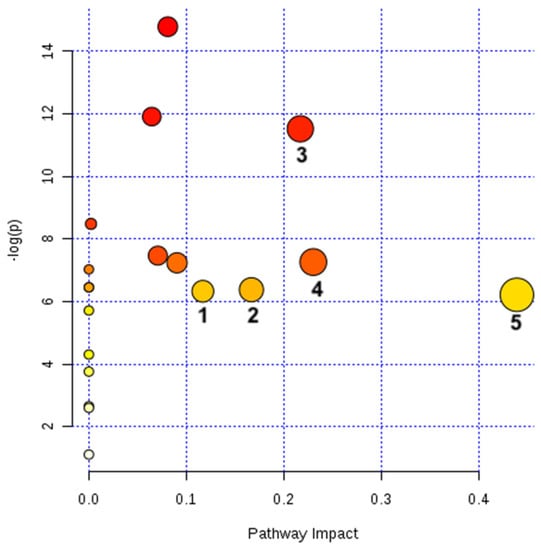 In the pathway analysis, through MetaboAnalyst, the reference organism used in the analysis was Chondrus crispus. The Globaltest algorithm and degree of centrality were used to measure the number of connections of each node []. This type of analysis provides the significance of the change (p < 0.05) and the pathway impact (significant > 0.1) relative to the relevance of the alteration in the representativeness of the metabolite on the pathway [,].