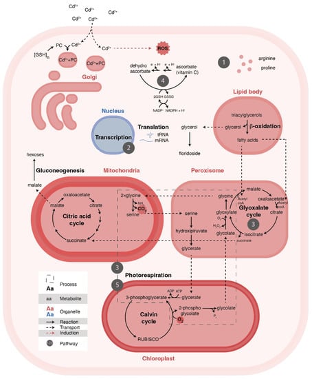Rubisco is regulated by metallic ion availability, which influences its specificity to CO2/O2, thus controlling the equilibrium between photosynthesis and photorespiration. Cadmium is able to increase Rubisco affinity to O2 in plants [], which may change the accumulation of glycine and glyoxylate, which are related to the maintenance of carbon flow under lower photosynthetic rate [,]. Higher activity of other important enzymes of glyoxylate metabolism in stress situations has been described in [,]. For these reasons, we suggest that when exposed to Cd2+, G. caudata, similarly to vascular plants, has a lower photosynthesis rate and, consequently, increased photorespiration (Figure 5).