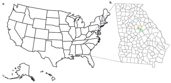 Sampling locations. (a) USA map and the state of Georgia and (b). County locations in the state of Georgia: yellow—Putnam County for Murder Creek and green—Baldwin County for the location of Tobler Creek.