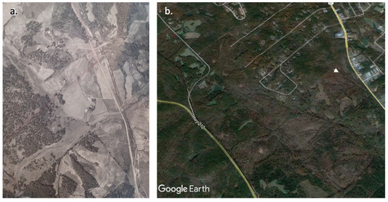 Aerial images of Tobler Creek within Andalusia Farm, Milledgeville, GA. (a). October 1937 and (b). October 2019 captured via the Google Earth application, sampling location showed with an arrow.