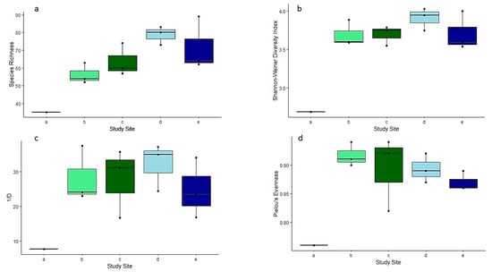 Boxplots for different community metrics per sample. Values calculated for sampling events. (a) Species richness (SR). (b) Shannon-Weiner diversity index. (c) Simpson’s inverse diversity (1/D). (d) Pielou’s evenness (J). Site IDs provided in Table 1.