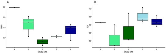 Boxplots for different diatom metrics per sample. (a) Multi-metric index (MMI). (b) Trophic Diatom Index (TDI). Site IDs provided in Table 1.