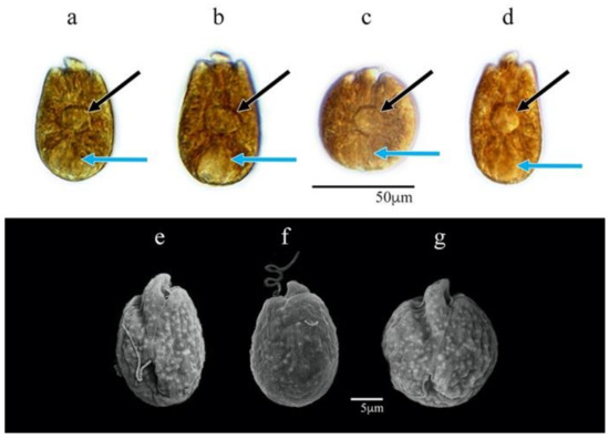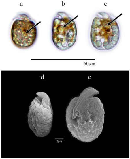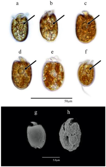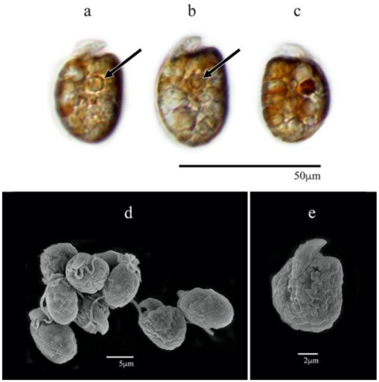 - Pérez-López, H.; Durán-Riveroll, L.; Gómez-Lizárraga, L.E.; Mendoza-Garfias, M.B. Simple method for preparing delicate dinoflagellate of the genus Amphidinium for scanning electron microscopy. Microsc. Microanal. 2020, 26, 1366–1369. [Google Scholar] [CrossRef]