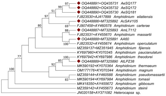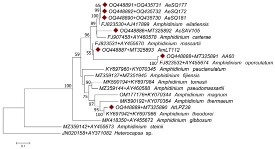 - Karafas, S.; Teng, S.T.; Leaw, C.P.; Alves-de-Souza, C. An evaluation of the genus Amphidinium (Dinophyceae) combining evidence from morphology, phylogenetics, and toxin production, with the introduction of six novel species. Harmful Algae 2017, 68, 128–151. [Google Scholar] [CrossRef] [PubMed]