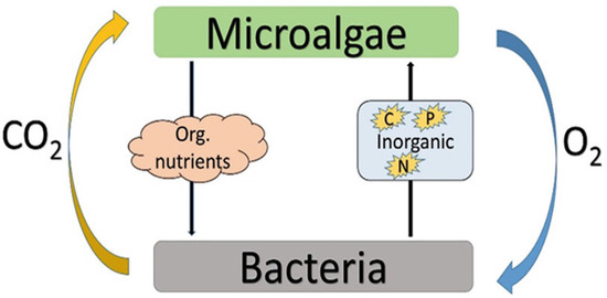 In this context, microalgal ponds have emerged as a promising platform where microalgae and bacteria collaborate symbiotically [4,5]. Bacteria enhance microalgal growth by producing auxins [6], and the reciprocal exchange of oxygen and carbon dioxide between microalgae and bacteria further amplifies the efficacy of the process [5,7]. Microalgal ponds effectively remove nitrogen and phosphorus via microbial growth and nitrification–denitrification processes [6,8,9,10].