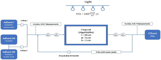 The experimental setup was composed of a dual-component system: a flow cell for synthetic wastewater inflow and a recycle vessel for effluent outflow, as depicted in Figure 2. Within the flow cell, a 1 mm PVC plastic sheet (0.018 m2) provided a substrate for the symbiotic biofilm, allowing a liquid layer of 2 cm to flow over it. Sensors positioned at the inflow and outflow of the flow cell continuously monitored the pH and dissolved oxygen (O2) concentration using InPro 6050/120 sensors from Mettler Toledo, Switzerland. The inflow pH was precisely maintained at 7.2 through controlled delivery of either acetate or a blend of acetate and acetic acid (as detailed later). To maintain a consistent temperature of 23 °C, a water-jacketed glass tube facilitated the recycling of synthetic wastewater.