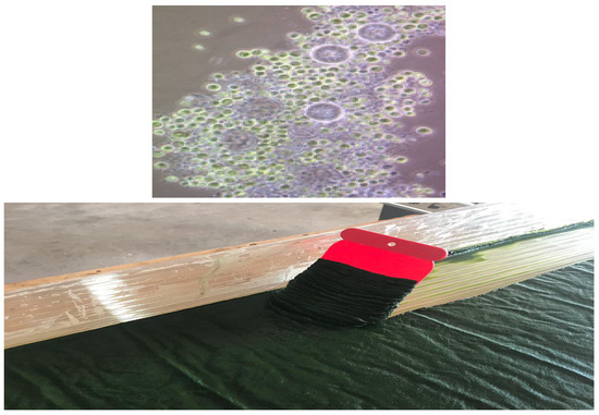 One challenge lies in efficiently separating the microalgal–bacterial biomass from the treated wastewater. Innovations like the development of symbiotic microalgal–bacterial biofilms offer a natural solution [11,12]. These biofilms enable the creation of a distinct boundary between the biomass and treated wastewater (Figure 1), thus facilitating the treatment process [13,14]. The potential of symbiotic microalgal–bacterial biofilms has been demonstrated in applications such as swine slurry treatment, where remarkable removal efficiencies of nitrogen, phosphorus, and chemical oxygen demand were achieved without an external oxygen supply [15,16,17,18].