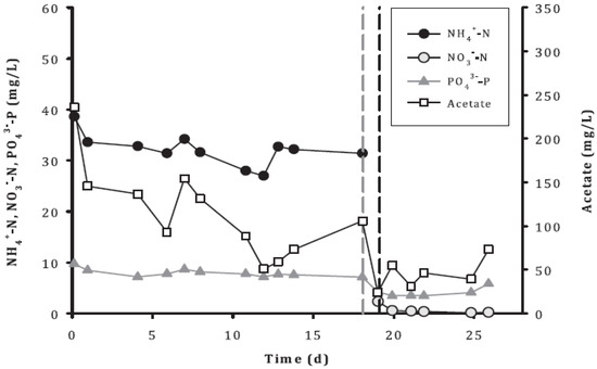 Experiment 4 assessed the additional N removal through nitrification and denitrification. Despite inoculation with nitrifying sludge, NH4+-N and NO3−-N concentrations remained relatively stable. On day 18, the N source was switched from NH4+ to NO3−, and the results demonstrated a significant N reduction along with acetate and PO43−-P decreases (Figure 5).