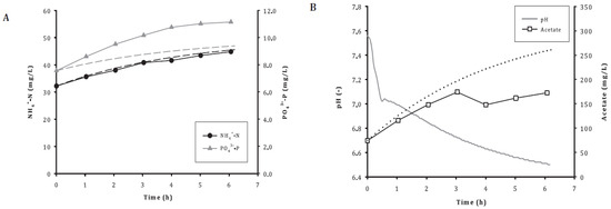To evaluate the yields of acetate, nitrate (NO3−-N), and phosphate (PO43−-P) obtained under different operation conditions, ionic chromatography with a conductivity detector was used. An anion-exchange column was used for the nitrate and phosphate analyses and a cation-exchange column for the acetate analysis. As a mobile phase, carbonate or bicarbonate were used as eluants for the nitrate and phosphate analyses and a cationic eluant for acetate. The flow rate was between 0.5 and 2.0 mL/min. The injection volume, between 5 and 100 µL, was adjusted according to the sensitivity and the analyte concentration. A Metrohm conductivity detector (Switzerland) was configured according to Compact IC 761. Prepared calibration standards with known analyte concentration were used for calibration. QC checks using blanks and standards were implemented for quality control.