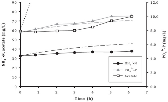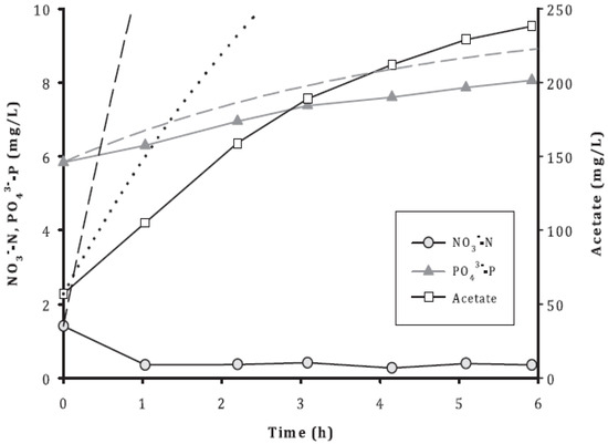 Effluent concentrations on NO3−-N, PO43−-P, and acetate under dark conditions (Test C). Theoretical increases in concentrations of NO3−-N, PO43−-P, and acetate resulting from inflow dilution are depicted by the black and grey dashed lines and the black dotted line.