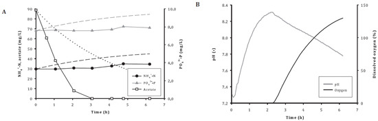 pH/dissolved oxygen levels (B) in effluent after acetate addition was turned off (Test D). The black and grey dashed lines, along with the black dotted lines marked as (A), illustrate the theoretical rise in NH4+-N, PO43−-P, and acetate concentrations (A) due solely to inflow dilution.
