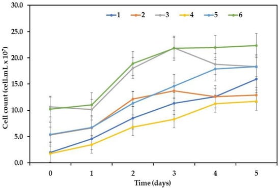3.3. Effect of Inoculum Concentrations on Total Biomass Productivity