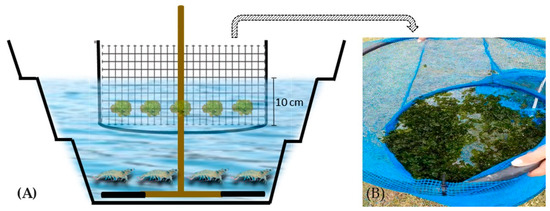 Diagram of the experimental units used for shrimp and macroalgae. (A) Tanks with a useful volume of 180 L, with constant aeration, and a circular structure for the macroalgae. (B) Circular structure with a diameter of 0.60 cm for the cultivation of macroalgae.