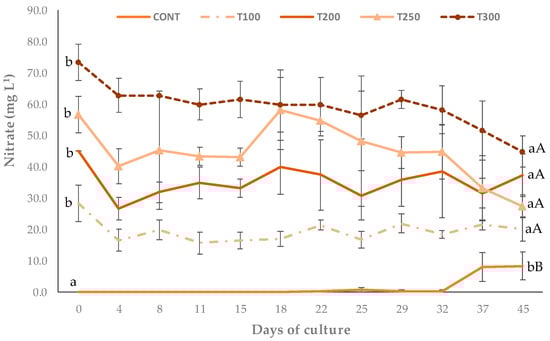 Nitrate concentrations in treatments CONT (cultivation in clear water), T100 (use of 25% biofloc inoculum, a concentration of approximately 100 mg L−1 of total suspended solids), T200 (use of 50% biofloc inoculum, a concentration of approximately 200 mg L−1 of total suspended solids), T250 (use of 75% biofloc inoculum, a concentration of approximately 250 mg L−1 of total suspended solids), T300 (use of 100% biofloc inoculum, a concentration of approximately 300 mg L−1 of total suspended solids). Different lowercase letters on the same line represent a significant difference (p ≤ 0.05) in the same treatment at the beginning and end. Different capital letters represent a significant difference (p ≤ 0.05) between treatments on the same day after performing a one-way ANOVA followed by Tukey’s test.