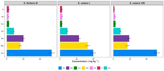 | Element | Limit of Detection (LOD) | (a) S. fluitans III | (b) S. natans I | (c) S. natans VIII | p-Value | Multiple Comparison Test |